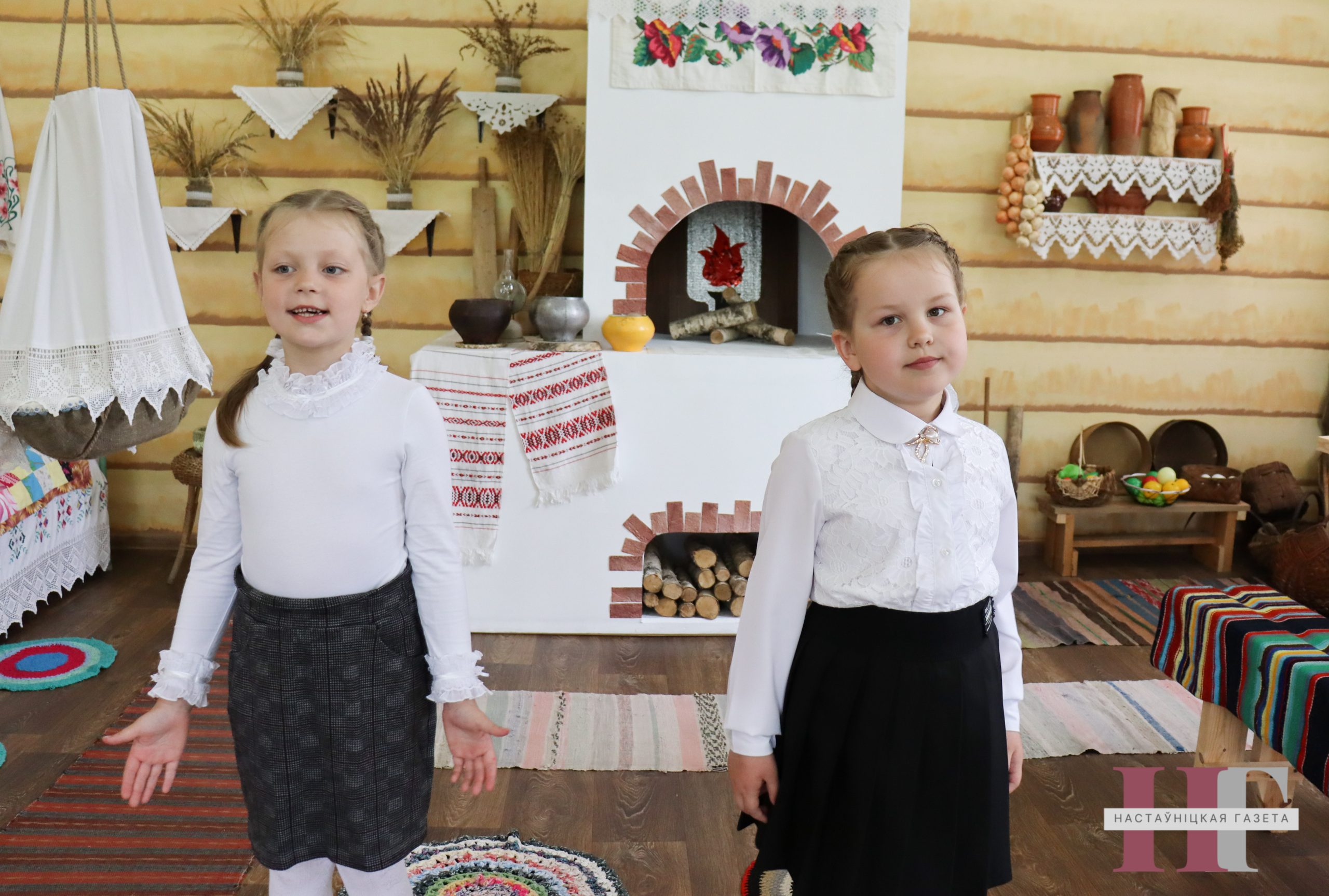 Пра тое, як беларусы жылі 100 гадоў назад, расказваюць маленькія экскурсаводы — выхаванцы дзіцячага садзіка. Перад карэспандэнтам выступілі Саша Ціманская і Ліза Скавародка. Іх падтрымлівала маладая выхавальніца Вікторыя Маляўка — у мінулым выпускніца гэтай дашкольнай установы.