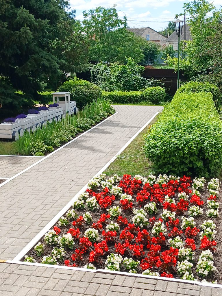 Тэрыторыю ўпрыгожвае жывая агароджа і аркі з кустоў спірэі і дзявочага вінаграду. Высаджана алея са стройных туй. Расліны радуюць вока круглы год. Ранняй вясной зацвітаюць фарзіцыя, прымулы, нарцысы і цюльпаны. За імі распускаюцца касачы, мускары і барвенак. Летам сад напаўняецца водарамі сальвіі, колеуса, лілей, лаванды і гейхеры. Восенню на клумбах цвітуць хрызантэмы і аксаміткі. З вясны да глыбокай восені радуюць кветкамі бягоніі, хосты і лазаніца, а круглы год — бадан, туі Смарагд і Даніка, ядлоўцы.