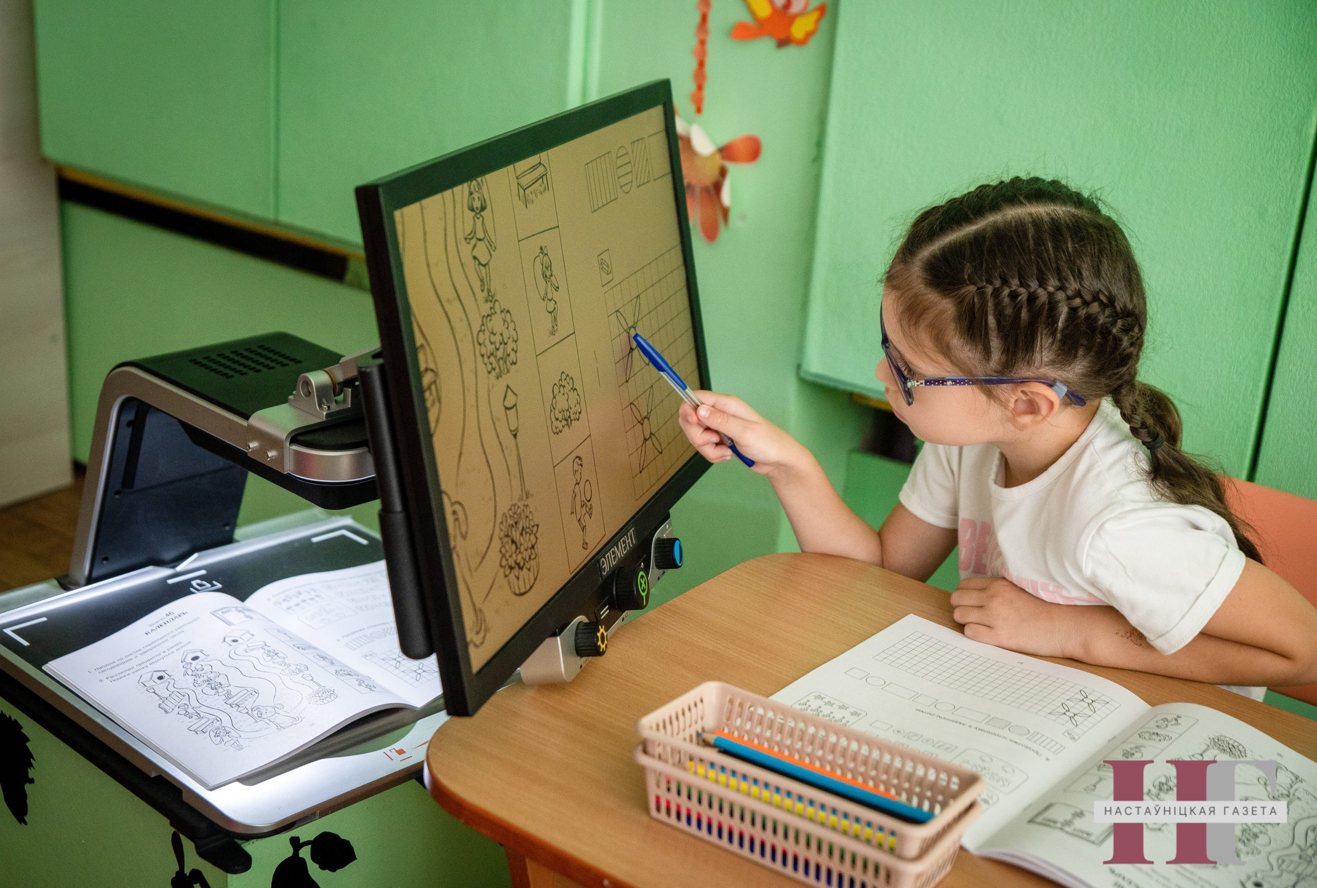 — Мы абапіраемся на патрэбы і магчымасці кожнага дзіцяці і ўлічваем рэкамендацыі афтальмолага, — расказвае педагог. — Гатовыя дапаможнікі не заўсёды падыходзяць для выхаванцаў: графіка можа быць занадта дробнай або недастаткова кантраснай. Таму ўсе матэрыялы і заданні адаптую пад канкрэтнага малога, многія з іх ствараю сама на камп’ютары. Часам для заняткаў патрабуецца дадатковае абсталяванне, напрыклад, павелічальнае шкло. Так, бацькі адной маёй выхаванкі з цяжкай прыроджанай паталогіяй вачэй набылі спецыяльны павелічальнік, які дазваляе разглядаць выявы з васьміразовым павелічэннем. Спачатку дзіця вывучае заданне ў кнізе праз экран прылады, а затым выконвае яго ў сшытку. У будучыні, калі дзяўчынка працягне навучанне ў школе, гэты прыбор будзе для яе незаменным памочнікам пры рабоце з падручнікамі.