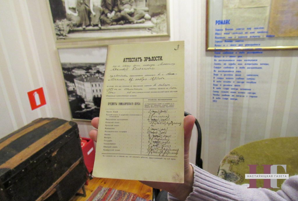 У музеі можна пабачыць копію атэстата Максіма Багдановіча аб заканчэнні ў 1911 годзе Яраслаўскай гімназіі.
