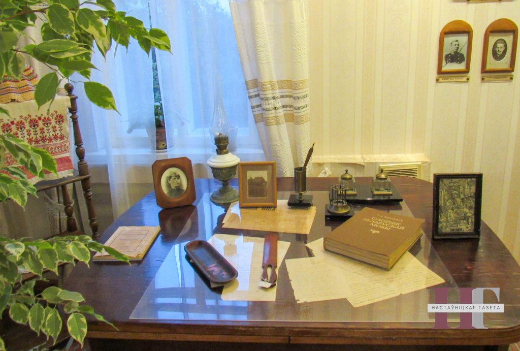 Адразу прываблівае да сабе рабочы стол, на якім усё быццам застыла ў чаканні юнага Максіма — пёравая ручка, чарніліца, нож для разразання паперы, масіўны “Слоўнік беларускай мовы” Івана Насовіча і пажаўцелыя аркушы з радкамі, напісанымі прыгожым почыркам паэта. Звяртае на сябе ўвагу рарытэтны дарожны куфар. Бялеюць клавішы старога фартэпіяна. Мякка пазірае з гравюры “Сіксцінская мадонна”, якая лічылася апякункай сям’і і натхніла паэта на стварэнне вершаванага цыкла “Мадонны”…