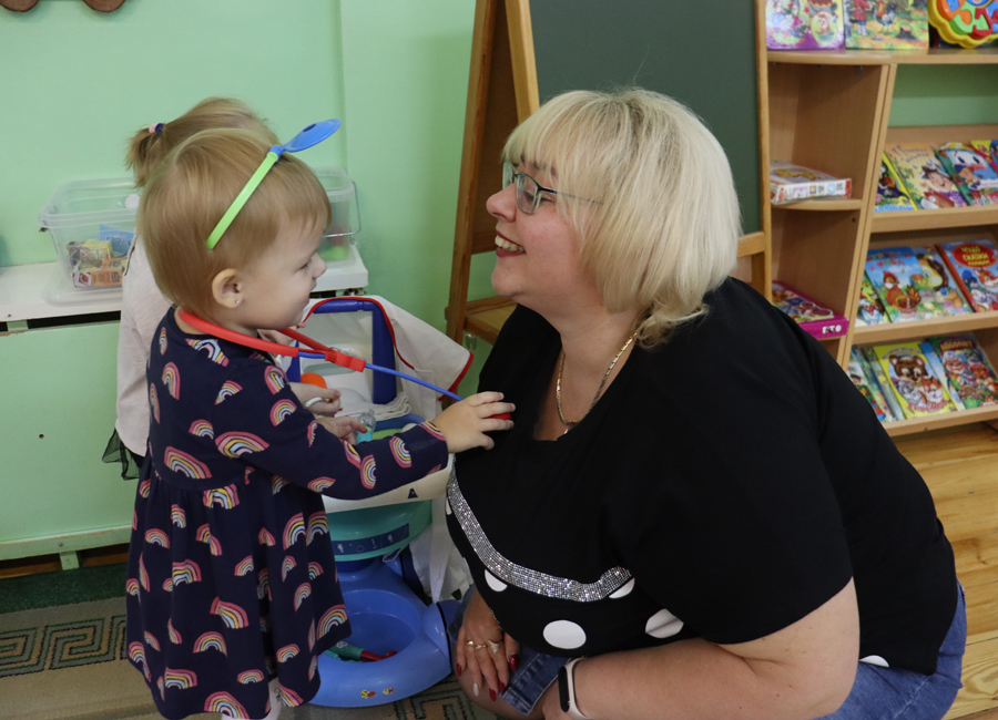 У Людмілы Астрамовіч зараз 16 выхаванцаў 2-3 гадоў, і ўсе яны хутка прывыклі да сада. Лёгкай лічыцца адаптацыя на працягу месяца. Сярэдняя — да 2 месяцаў, а цяжкая — да 6 месяцаў. Улічваецца не толькі эмацыянальны стан дзіцяці, але і тое, як часта яно хварэе. Для таго каб стварыць добры настрой малышам, Людміла Уладзіміраўна арганізоўвае адаптацыйныя развіццёвыя гульні. Пачынае з простых, напрыклад, пускае мыльныя бурбалкі, а дзеці радасна іх ловяць, забываючыся аб ранішніх перажываннях з-за расставання з мамай. Або падчас гульні педагог раскідвае па групе маленькія мячыкі, а дзеці даганяюць іх і збіраюць у кантэйнер. Калі малы прыйшоў у сад не ў настроі, Людміла Уладзіміраўна звяртаецца да яго: “Добрай раніцы, носік (вочкі, вушкі, роцік, ручкі, жывоцік)!” (дакранаецца да іх), “Вы прачнуліся? А вы, дзеткі, прачнуліся?”. Хтосьці з дзяцей можа і ножкай тупнуць, маўляў: “Не добрай раніцы”. Але ж большасць падхоплівае інтрыгу. Раптам педагог кажа: “Паглядзіце, за акном коцік пабег!”. І выхаванцы бягуць да акенца, забыўшыся пра слёзкі. А можна правесці пальчыкавую гульню: на дзверы павесіць замочак і прапанаваць дзіцяці адкрыць яго, папярэдне пацягнуўшы, пастукаўшы, пакруціўшы. Або навобмацак здагадацца, што ляжыць у мяшочку, які прынёс зайчык.