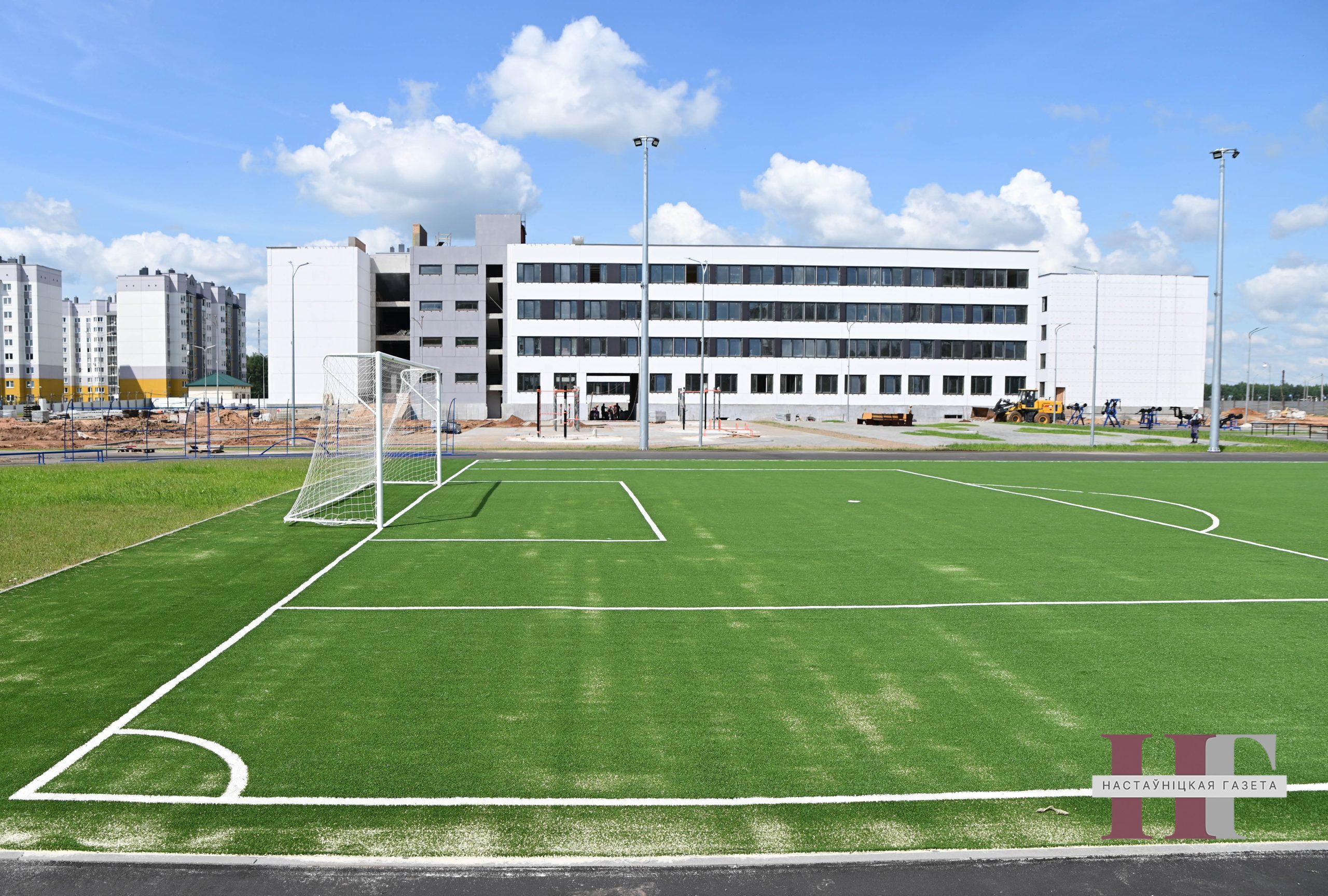 Калі цэнтральная пляцоўка школы яшчэ ў працэсе стварэння, то тэрыторыя для заняткаў спортам ужо гатова. Сучаснае футбольнае поле, варкаўт-пляцоўка і пляцоўкі для гульні ў тэніс, баскетбол і валейбол, бегавая дарожка чакаюць юных спартсменаў.
