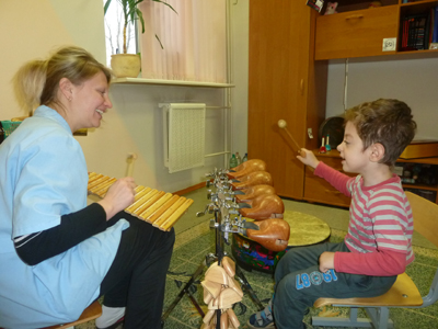 Музычны кіраўнік выкарыстоўвае на занятках не толькі звыклыя для нас інструменты, напрыклад, гармонік, але і нетрадыцыйныя, якія прапанавалі замежныя калегі. Гэта “барабаны, якія гавораць” — набор бонга (два невялікія здвоеныя барабаны), або “акіянічны” барабан, яны падбіраюцца ў залежнасці ад патрэб дзіцяці. У ход ідуць бразготкі, клавіятура, набор вісячых званочкаў і маленькіх талерак, бамбукавая палачка, якая ўзнаўляе гукі дажджу, “какосавыя далонькі” і іншае. Лячэбны эфект аказваюць рытм і тэмп, вібрацыі гучання інструментаў. Дзеці ж рэагуюць на іх гучанне па-рознаму: адны замаўкаюць і ўважліва слухаюць, некаторыя вакалізуюць, дэманструюць радасць — іх рэакцыя залежыць ад структуры парушэнняў. Устанавіць кантакт пры дапамозе музыкі магчыма амаль з усімі дзецьмі, нават з тымі, у якіх сур’ёзныя праблемы з камунікатыўнасцю, напрыклад пры аўтызме.