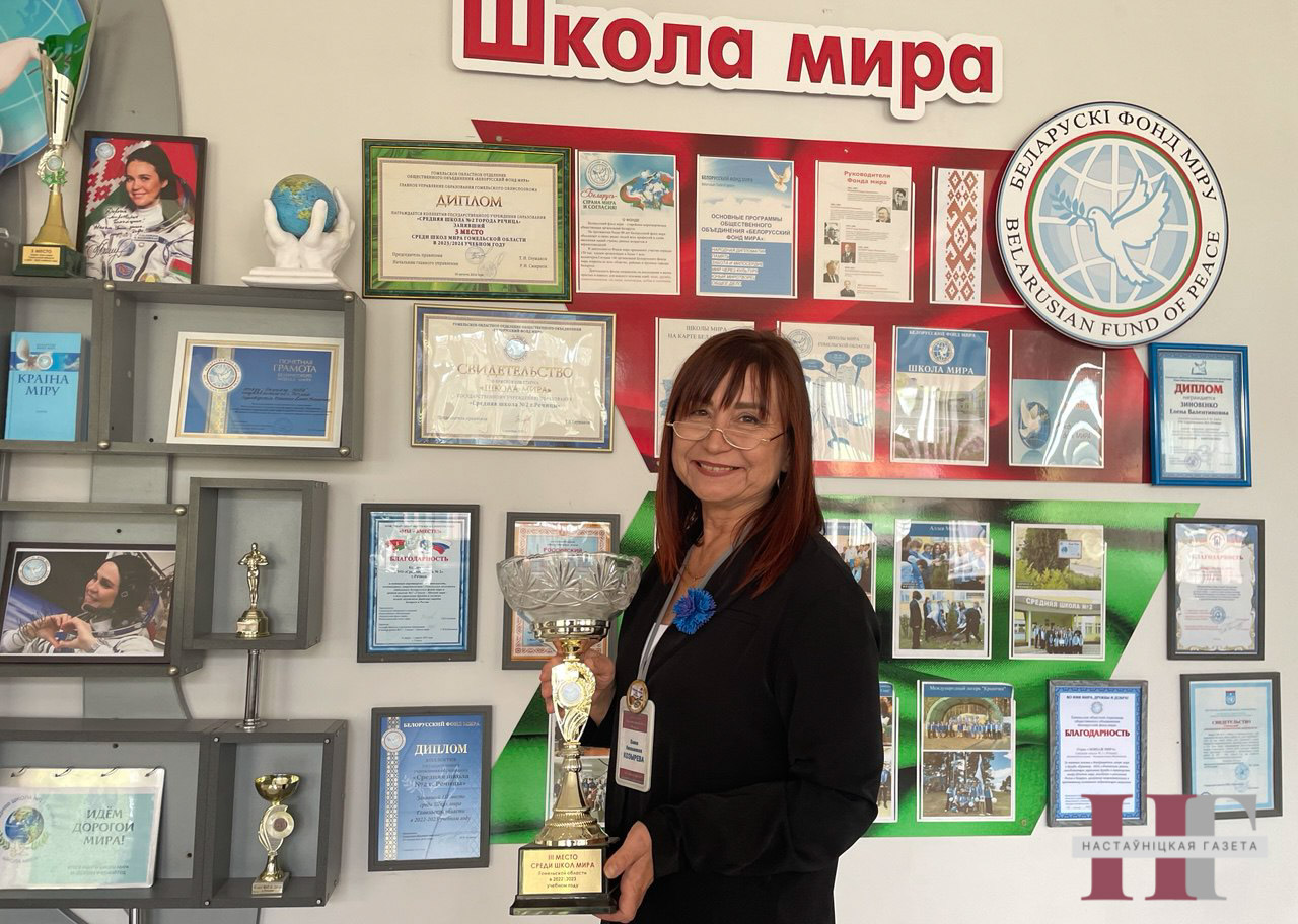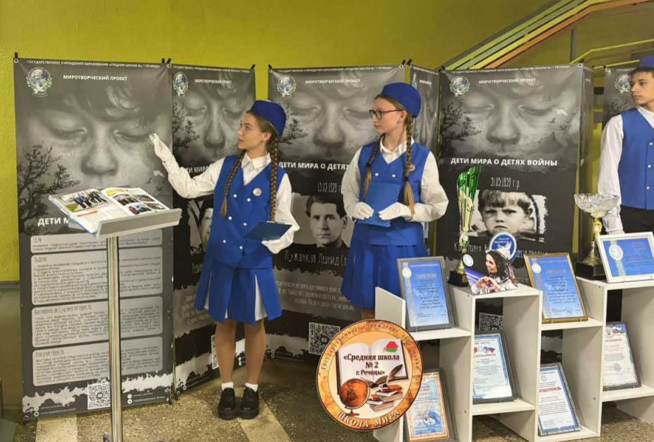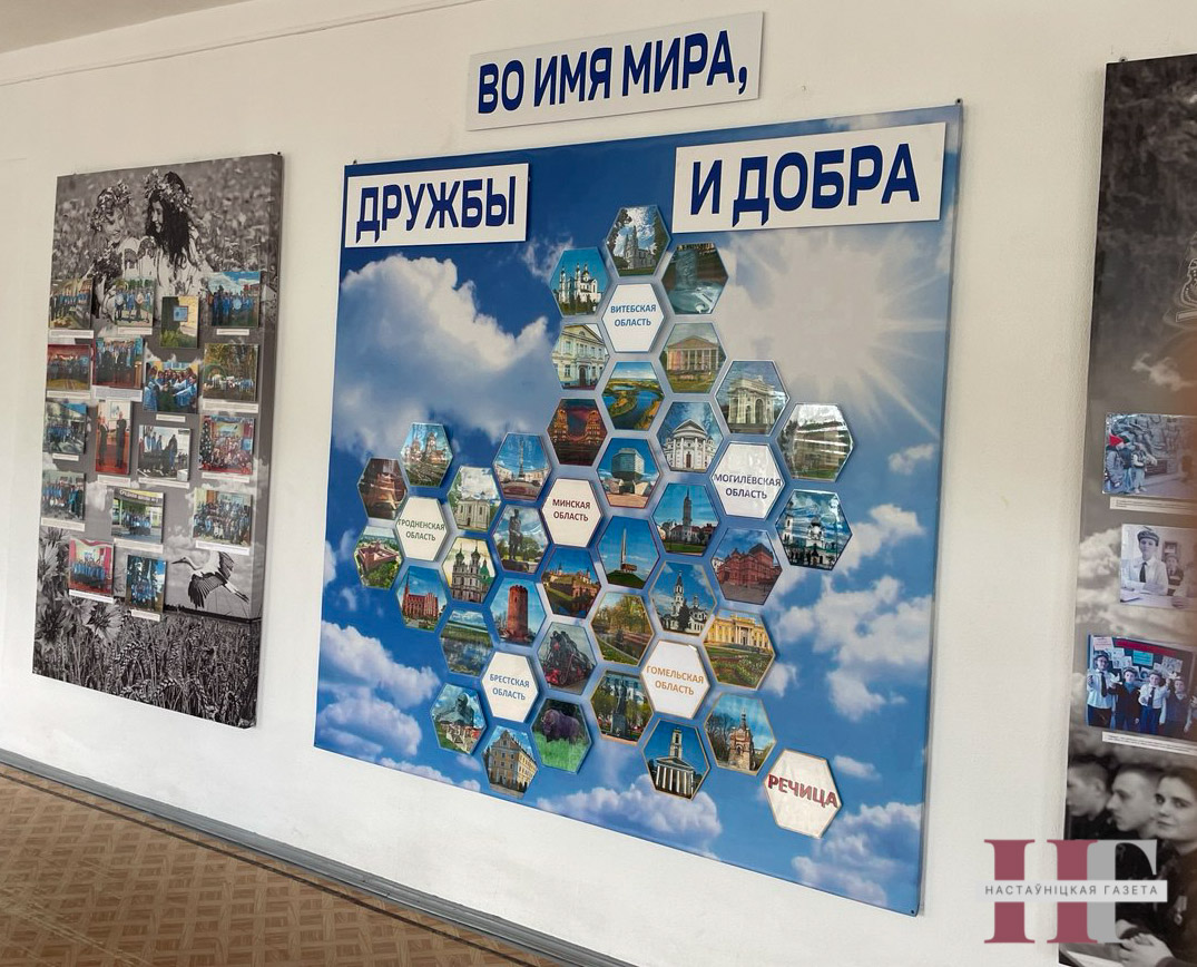 Што гэта менавіта Школа міру — бачым прама ў холе на першым паверсе. Кубкі за перамогі, дыпломы, фотаздымкі… Паказваючы тэматычны стэнд, намеснік дырэктара па выхаваўчай рабоце і куратар міратворчых праектаў Алена Козырава звяртае ўвагу на два аўтографы Героя Беларусі — намесніка старшыні праўлення Беларускага фонду міру Марыны Васілеўскай. Здымкі зафіксавалі сумесную працу школы і з Цімафеем Глушаковым, старшынёй Гомельскага абласнога аддзялення фонду. Вядомага міратворца летась не стала, але жыве пачатая ім справа — міжнародны дзіцячы палатачны лагер сяброўства славянскіх народаў “Крынічка”. У ім бывалі таксама і юныя рэчыцкія міратворцы.
