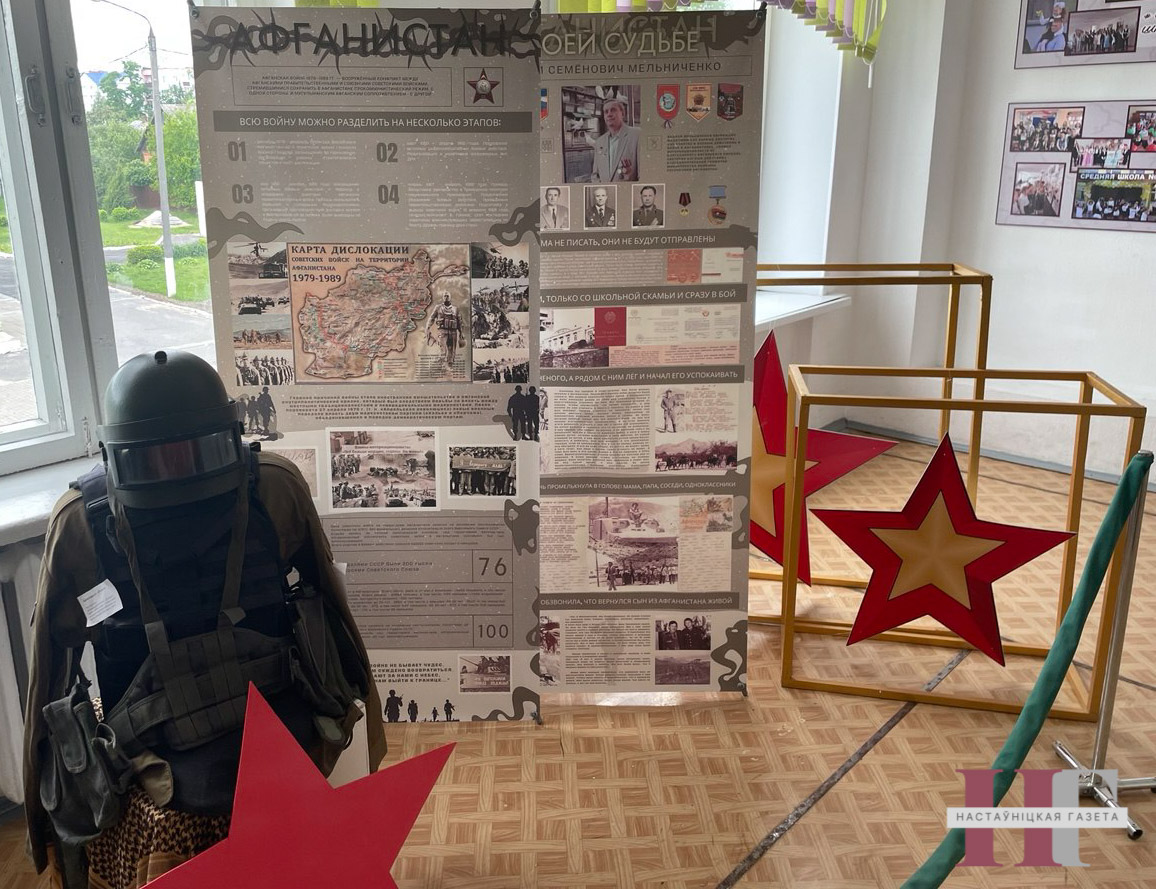 “Праходзіў раённы конкурс праектаў пра Афганістан, і мы адкрылі для сябе ў Рэчыцы былога воіна-афганца, яго ўнук у нас вучыцца, — паказвае экспанаты Алена Мікалаеўна. — Сабралі матэрыял, зрабілі своеасаблівы “афганскі куток”. Тут ёсць нават браняшлем “Алтын”, а якраз такія былі 27 снежня 1979 года ў байцоў савецкіх спецпадраздзяленняў пры аперацыі “Штурм палаца Аміна”. Нам гаварылі, што шлем і цяпер на ўзбраенні ў некаторых падраздзяленнях. І бронекамізэлька, што на манекене, з гісторыяй. Такія былі на тых, хто вызваляў заложнікаў тэрарыстаў у 1-й школе Беслана: там 1 верасня 2004 года ў заложніках аказаліся звыш тысячы школьнікаў, іх бацькоў і настаўнікаў. На такім прыкладзе бачна, да чаго прыводзяць нянавісць і варожасць і які няўстойлівы, далікатны мір на зямлі”.